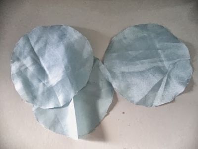 2 lipat lingkaran jadi 1/2 lingkaran lantas lipat lagi hingga membuat pola seperti gambar dibawah. kemudian jahit tiap-tiap ujungnya. kerjakan juga ke lingkaran yang lain hingga menjadi 5 segitiga.